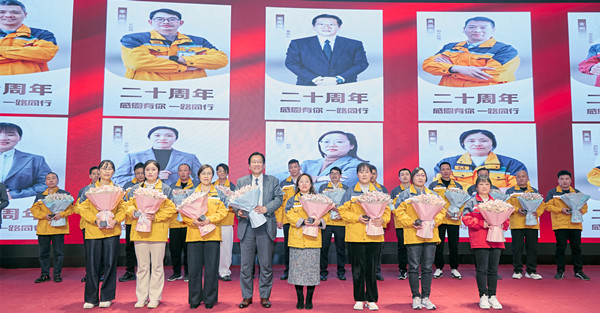 As the evening was in progress, a solemn and warm "20th Anniversary Employee Award Ceremony" brought the evening to a climax. Chairman Mr. Horio Hirohide presented commemorative medals to employees who have been with the company for 20 years, paying tribute to their sincere dedication through thick and thin with the company.